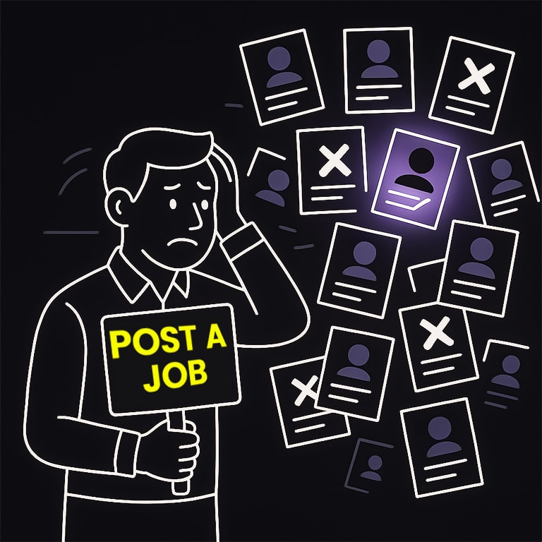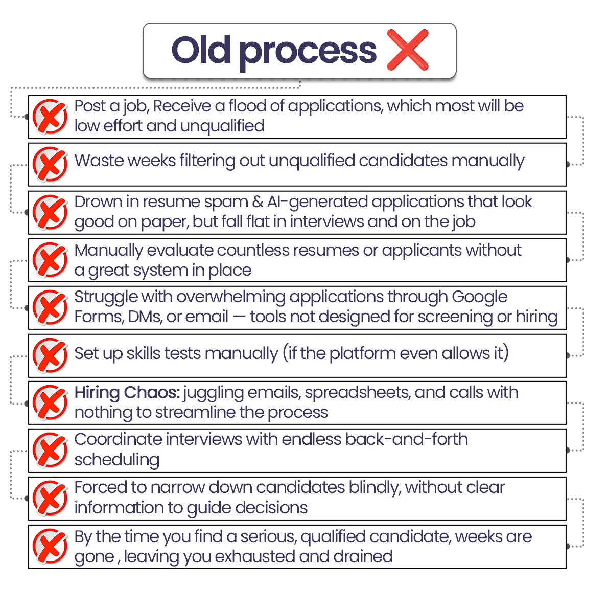 This exhausting process drains your time, energy, and resources, increasing the risk of costly hiring mistakes. It leaves you buried in tedious tasks and endless frustration—when your focus should be on securing the top talent your business needs to succeed.