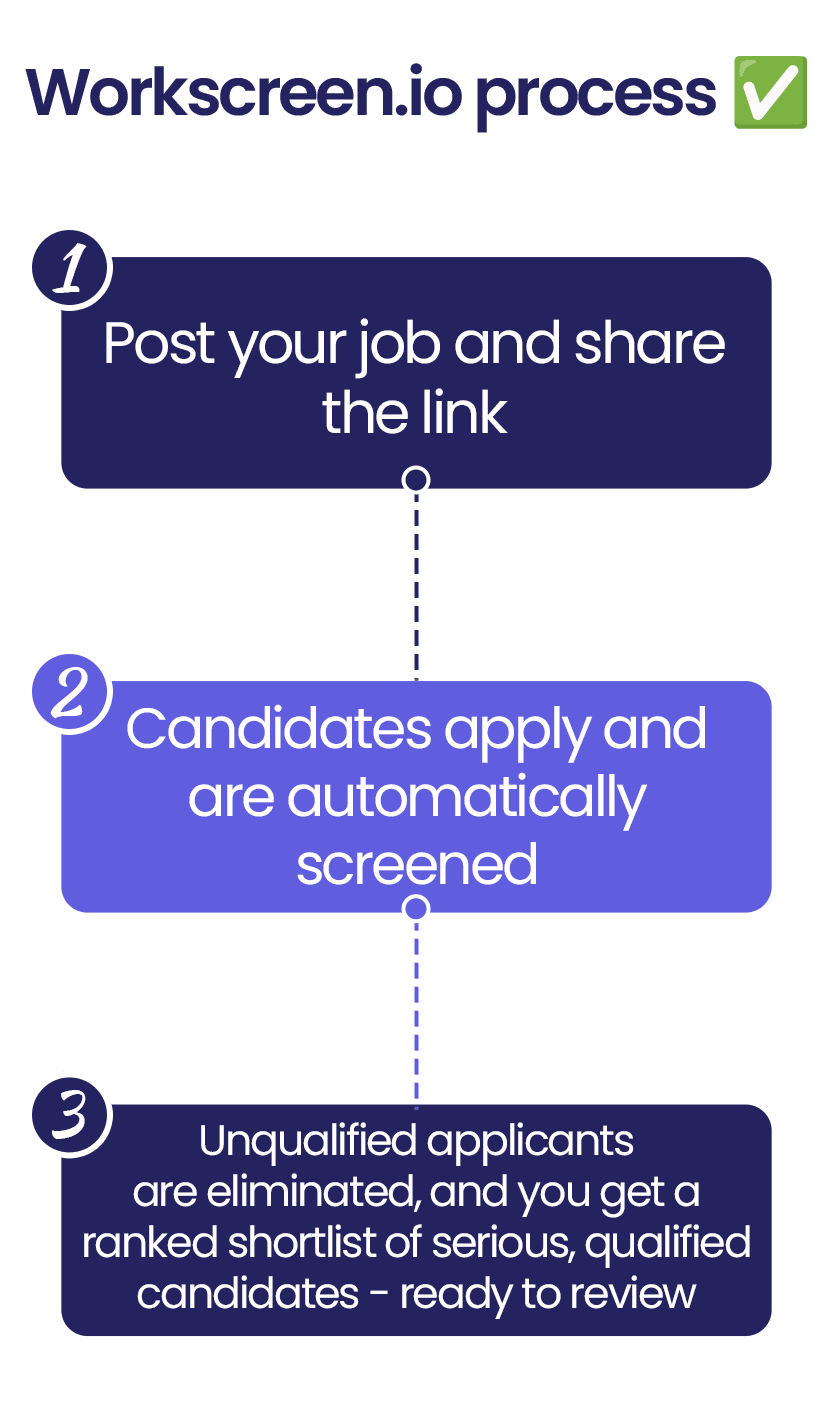 That’s exactly what WorkScreen does. It cuts through the noise automatically, so you only spend time on candidates who’ve already proven they’re qualified and serious about your job.